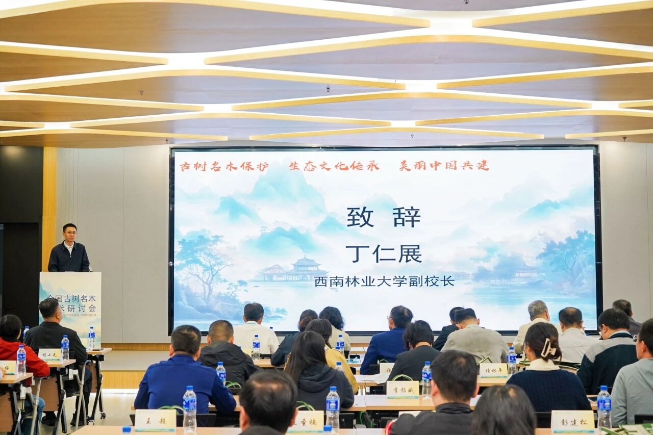 丁仁展向会议的召开表示热烈的祝贺,其在讲话中表示,古树名木作为自然与文化遗产的综合体,是林学、园艺、生态学等多学科交叉研究的重要载体,OK138太阳集团始终秉持生态优先、绿色发展理念,长期致力于西南地区生物多样性保护与生态修复研究,开展了一些古树名木保护的工作。学校作为古树名木分会的理事长单位,将以承办此次研讨会为契机,积极搭建合作交流平台,进一步加强与全国同行的交流合作,全力做好服务保障工作,推动古树名木保护理论创新与技术应用,为生态文明建设贡献智慧和力量。