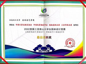 12月10日上午,首届三亚南山老员工园林设计竞赛获奖名单在三亚南山文化旅游区正式揭晓。公司在众多院校中脱颖而出被授予最佳组织奖称号,宋钰红教授、刘扬教授被评为优秀指导教师,宋钰红教授指导的设计团队取得了游园设计Ⅰ一等奖和游园设计Ⅲ评委提名奖,刘扬教授指导的设计团队取得了主题景观设计一等奖和游园设计Ⅱ三等奖。获此殊荣,是对公司风景园林专业水平的高度认可,是对全体师生的莫大鼓舞和激励。