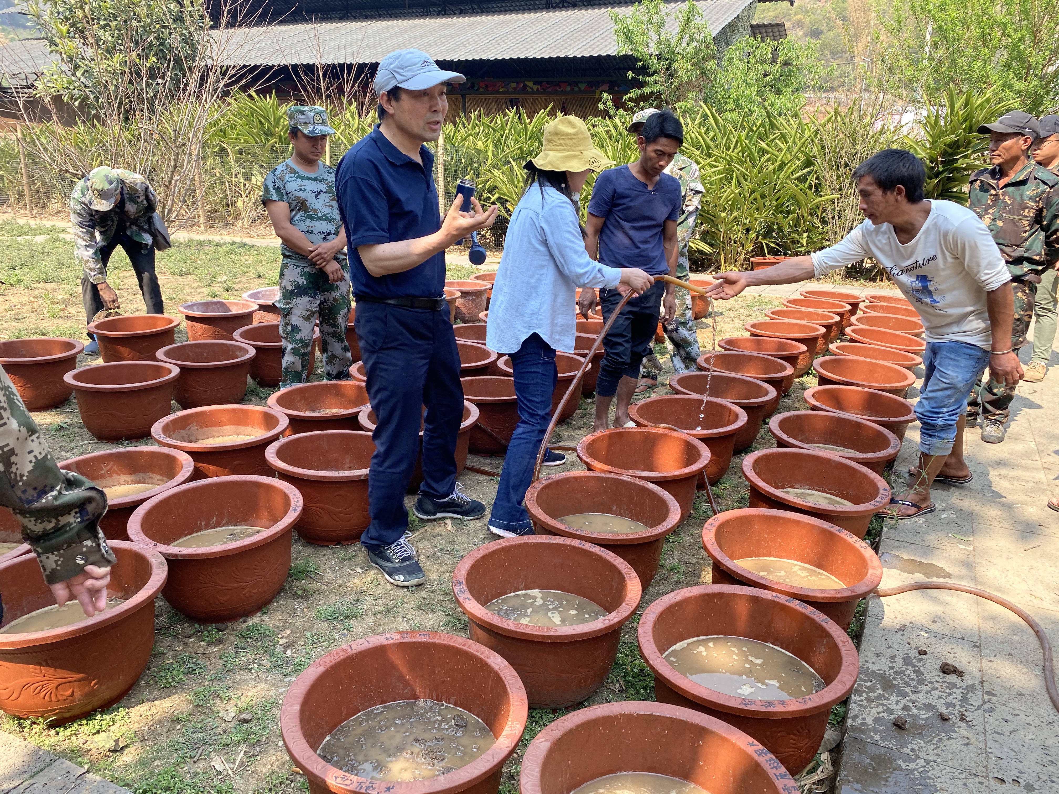 时值莲藕栽培季节,为了让学员们更好地掌握莲藕栽培技术,陈龙清教授深入浅出地讲解了莲藕 “藏头露尾”的栽种技巧,以及浮叶期和立叶期的管理要点。他形象地描述了莲藕犹如“地下树”般沿着缸盆边缘向下扎根及向上发芽的生长特性,在确定每一位学员掌握莲藕种植要点后,带领团队老师与学员们一起完成了从挖池塘淤泥、装缸、灌水、选带芽莲藕到栽种的整个过程,随后通过图片展示的方式详细讲解了后期的栽培管理技术。最后,团队成员给每个学员发放了2个品种的种藕以及“太空莲”的莲子,供学员们回到当地进行栽种实践。很多学员表示,这样的授课方式让他们很容易理解和接受,同时对自己回去种植莲藕和发展当地的莲藕产业有了更大的兴趣以及更充足的信心。