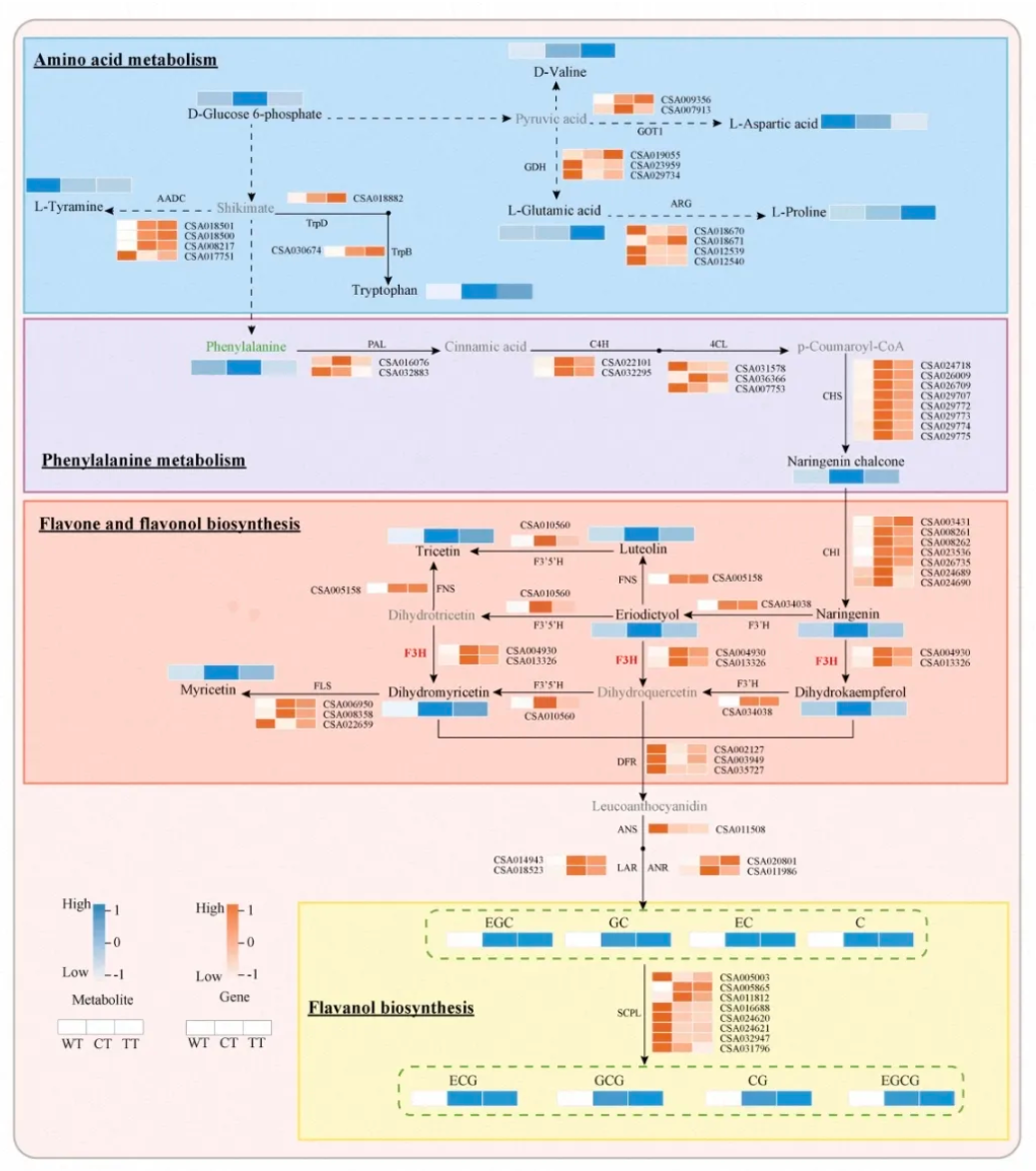 此外,转录组分析鉴定出大量差异表达基因(DEGs)。KEGG通路富集分析表明,黄酮类生物合成(Phenylpropanoid biosynthesis,Flavonoid biosynthesis)和氨基酸代谢(Alanine, aspartate and  glutamate metabolism, Arginine biosynthesis)是三类茶树差异最显著的代谢通路。通过构建代谢通路图谱,此研究将关键代谢物的积累变化与结构基因(如PAL, 4CL, CHS, CHI, F3H, ANS, ANR, LAR, SCPL等)的表达模式相关联。研究发现,CT中黄酮类生物合成上游通路基因(如PAL, 4CL, C4H, CHS, CHI)以及中游的F3H基因普遍上调表达,这与CT中丰富的黄酮类前体和儿茶素积累高度一致。通过WGCNA分析构建了三个共表达模块(棕色、蓝绿色和蓝色模块),这些模块中的基因与黄酮类和氨基酸的积累密切相关。进一步分析发现,15个MYB和bHLH转录因子与关键结构基因(如CHS、CHI和F3H)表现出强正相关(r > 0.8, P < 0.05),表明它们可能在调控黄酮类和氨基酸的生物合成中发挥重要作用。这些转录因子与代谢物之间的关联为理解茶树风味形成的分子机制提供了新的见解。