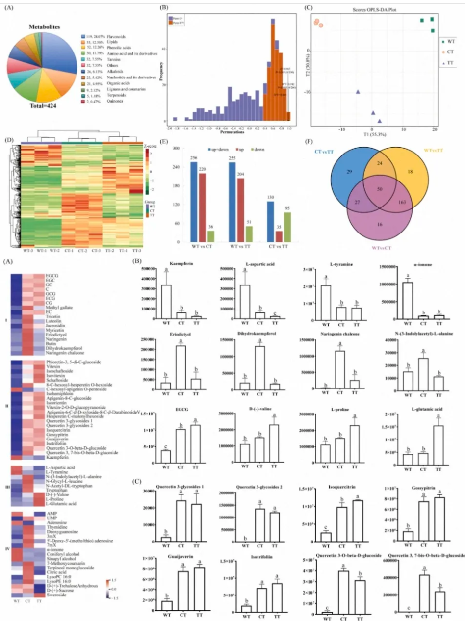 此研究结合广泛靶向代谢组学和转录组学技术,对三种类型茶树鲜叶进行了系统分析。关键代谢物分析显示,黄酮类化合物(尤其是黄酮醇苷类)和多种游离氨基酸在CT鲜叶中显著富集,这可能是CT所制茶叶(如普洱茶)通常呈现醇厚饱满风味的重要物质基础。其中,8种主要儿茶素单体(EGC, GC, EC, C, ECG, GCG, CG, EGCG)在CT和TT中的含量均显著高于WT,特别是EGCG在TT中达到峰值,这解释了TT鲜叶通常具有更强烈苦涩味的原因。此外,槲皮素糖苷在CT和TT中显著积累,可能与茶的苦味感知有关。WT鲜叶则表现出独特的代谢特征:α-紫罗兰酮(赋予独特木香/花香)和木质素前体(松柏醇、芥子醇)含量显著高于CT和TT,这可能是野生茶独特香气的来源之一,也反映了其在较高海拔环境(2050-2500米)下的适应性响应。WT中还积累了更多的蔗糖、海藻糖等糖醇类物质,可能有助于平衡风味。L-茶氨酸在WT和CT中的含量高于TT,提示古茶树资源可能具有更高的健康价值潜力。