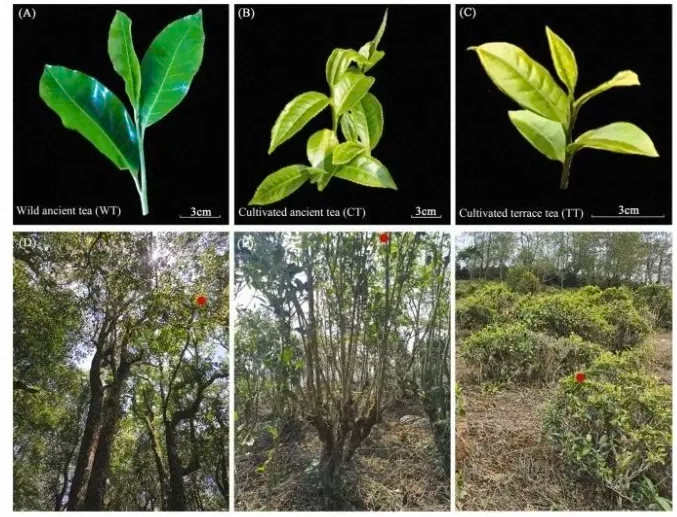 茶(Camellia sinensis ( L. )0.Ktze. ) )作为全球重要的经济作物,其鲜叶中丰富的代谢物是茶叶品质与风味的前体物质。此研究聚焦于云南省三种具有代表性的茶树资源:野生型古茶树(WT, C. taliensis)、栽培型古茶树(CT, C. sinensis var. assamica)和栽培型台地茶(TT, C. sinensis var. assamica),旨在揭示不同类型茶树鲜叶在代谢物积累和转录调控层面的差异及其对茶叶风味形成的贡献。