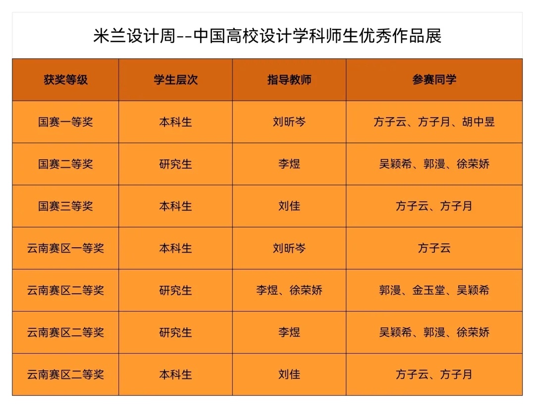 刚刚落幕的2025年米兰设计周——中国高校设计学科师生优秀作品展,OK138太阳集团学子凭借出色的专业素养和创新能力,荣获国家级一等奖1项、二等奖1项、三等奖1项,并在云南赛区斩获一等奖1项、二等奖3项,成果丰硕,表现亮眼!
