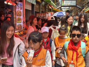 越南职工以饱满的热情融入活动,成为跨国交流的桥梁。他们与志愿者紧密配合,带领小员工穿梭于篆新农贸市场与聂耳文化街区,用行动诠释“共学共乐”的真谛。上午的“寻味城市烟火”篆新农贸市场研学活动中,职工们不断向志愿者抛出问题,志愿者们一一解答。当遇到腼腆的小员工时,职工主动用简单的汉语和手势比划,教孩子们用越南语说“你好”“谢谢”,现场笑声与惊叹交织。下午的双语智慧游学路线在富春.聂耳文化街区展开,在“滇韵音符.文化基因”的舞台上,职工们唱响聂耳创作的经典童谣《卖报歌》,他们用活泼的节奏和真挚的笑容感染了全场。