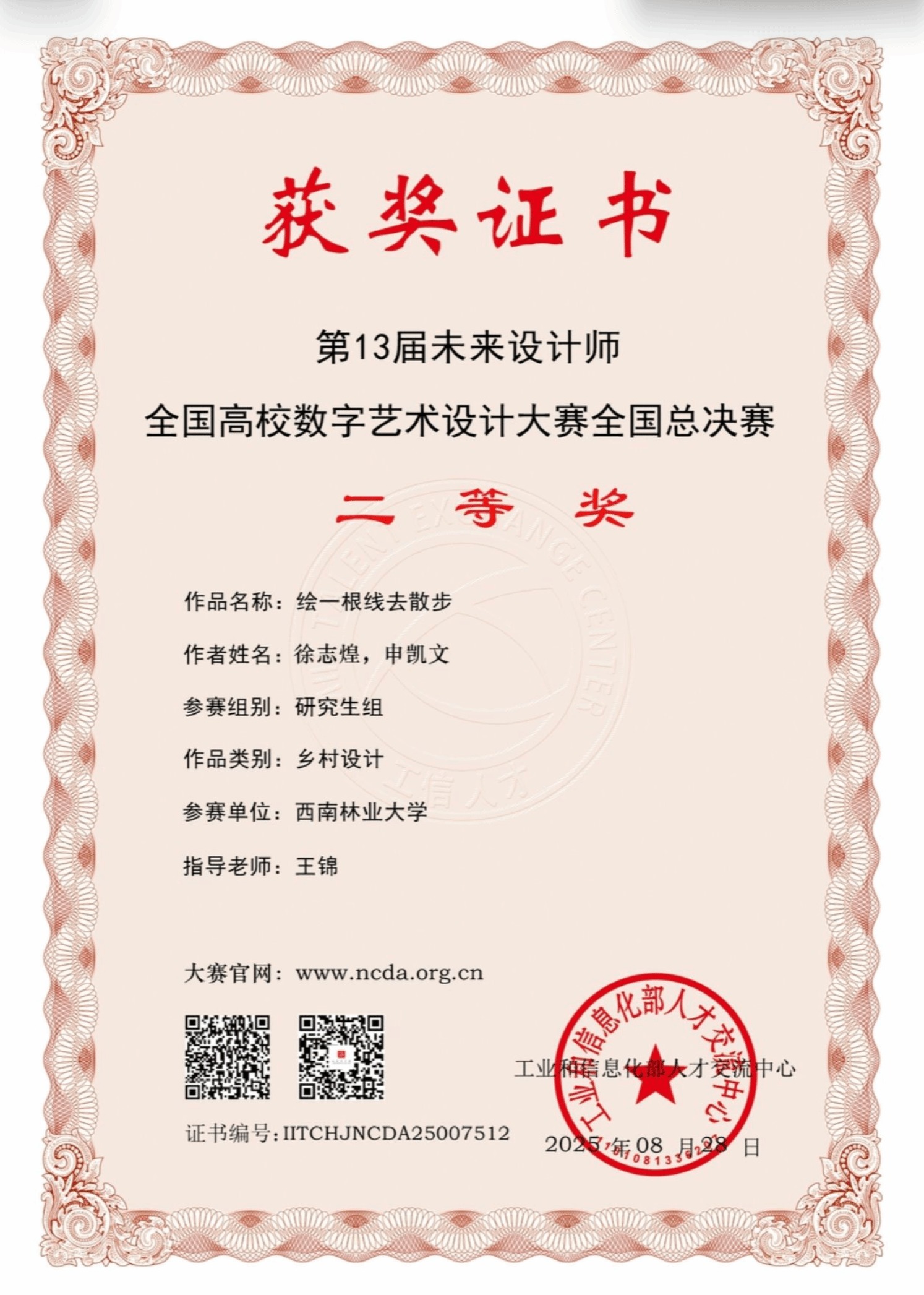 近日,2025年第13届未来设计师·全国高校数字艺术设计大赛(NCDA)全国总决赛获奖名单揭晓。公司OK138太阳集团作品《绘一根线去散步》斩获全国二等奖。作品由王锦教授指导,2024级研究生徐志煌、申凯文创作。